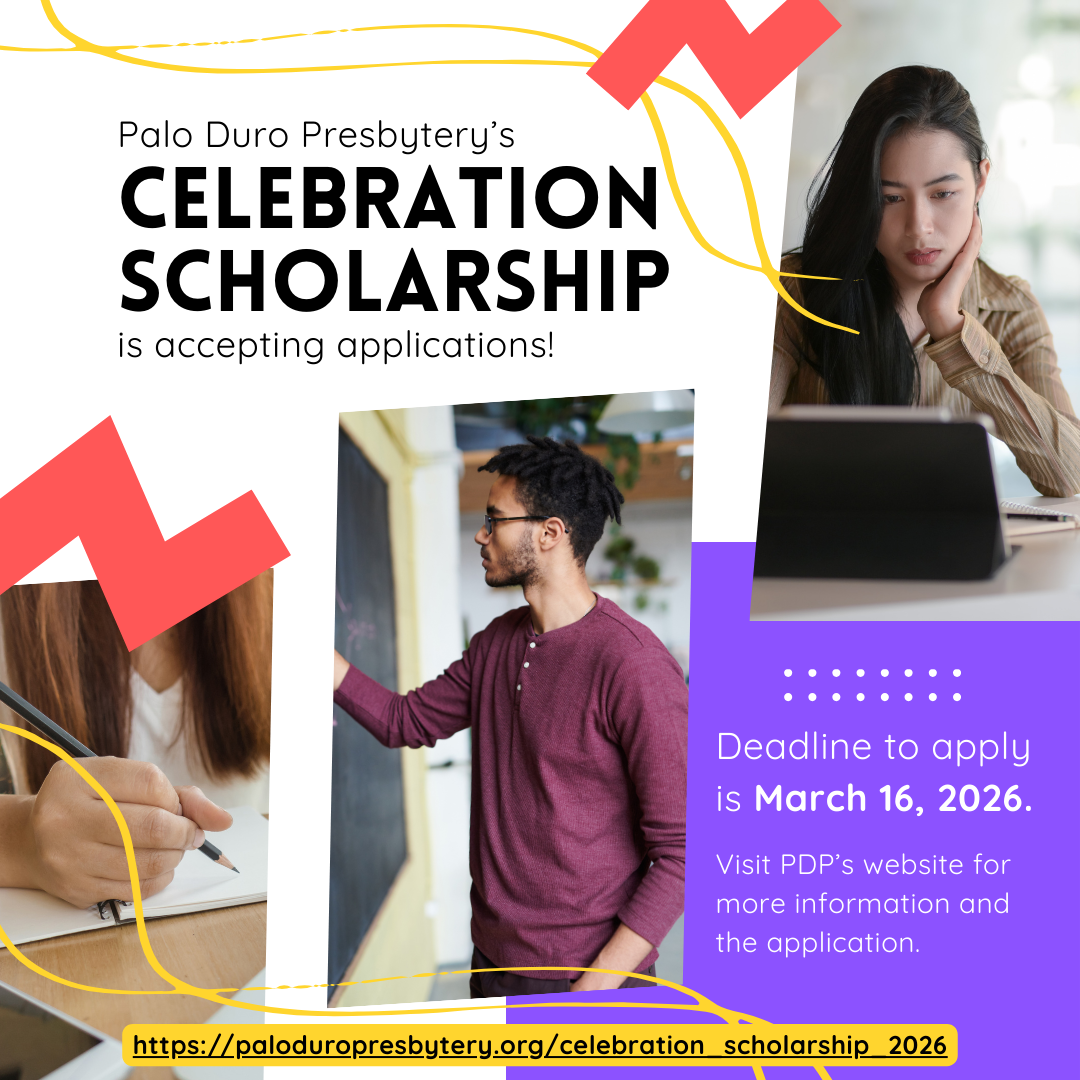 Scholarships extend up to eight semesters ($500 each semester) and are awarded to graduating high school students.  Students must be active members of PC(USA) congregations located in Palo Duro Presbytery and wish to attend post-secondary institutions of learning.